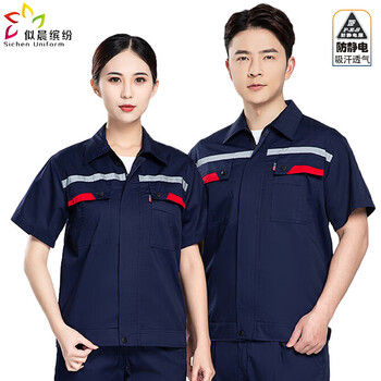 似晨缤纷 防静电短袖工作服夏季薄款套装男中石油石化加油站工人劳保服定制 藏蓝色短袖套装170/L