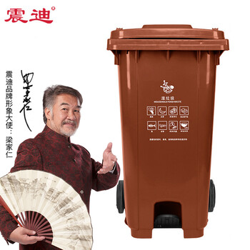 震迪 塑料垃圾桶 120L上海款分类标准(湿垃圾)脚踩咖啡色环卫垃圾箱小区带盖工业筒可定制 KT509翻盖带轮轴