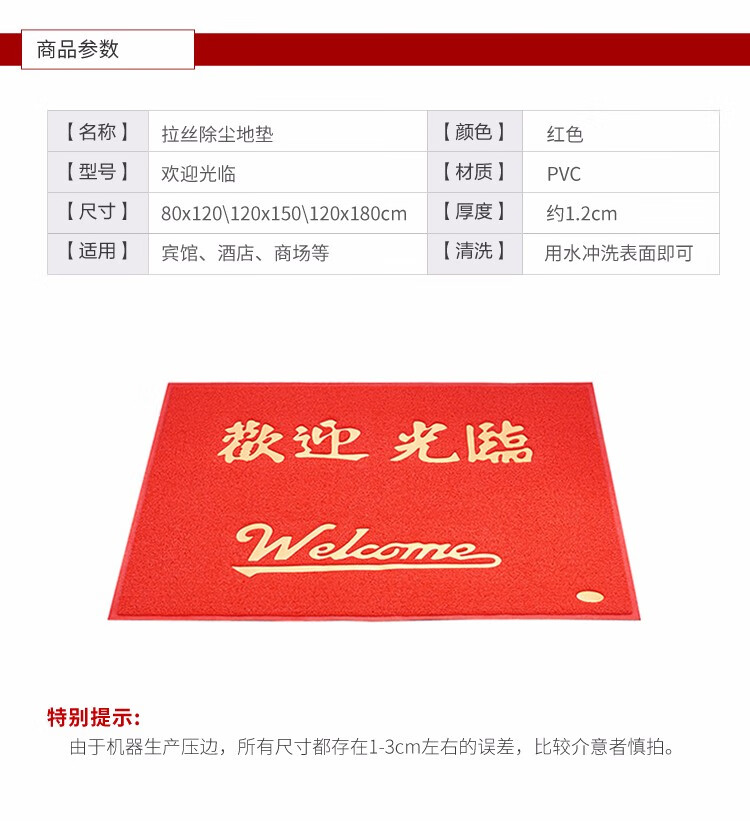 尺寸: 120*180CM 货号: LS-1031 重量: 5.5KG 名称: 拉丝款欢迎光临地垫防滑门垫