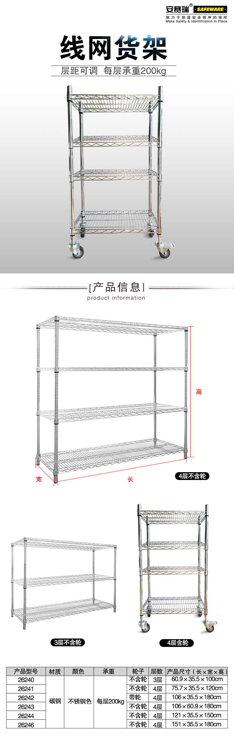 安赛瑞 线网货架 仓储移动置物架 碳钢镀铬展示架 可配轮 121×35.5×150CM×4层 26244