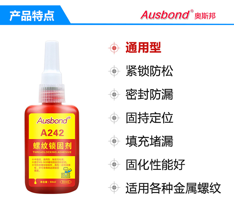 奥斯邦(Ausbond)242螺纹锁固剂中强度紧固厌氧胶螺丝防松胶密封胶水通用型固持定位防松动耐落胶蓝色50ml