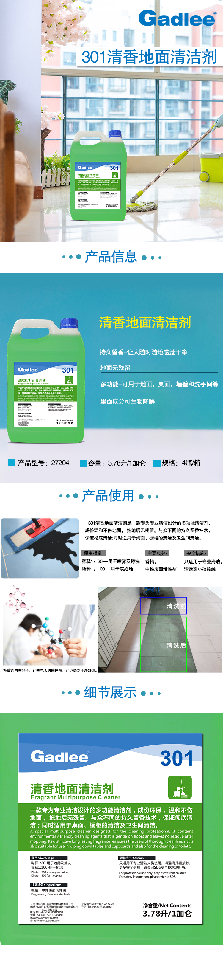 Gadlee(嘉得力)301清香地面清洁剂 3.78L×4瓶 商用地板地面清洗剂 27204
