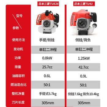 发动机品牌 三菱/MITSUBISHI 发动机型号 TU43二冲程引擎 发动机产地 中国 上海 排 量 42.7CC 额定转速 9500r/min 燃油箱容积 1L 使用燃油 25:1混合油 起动方式 手拉反冲起动 净重 10.4kg(不含刀具) 传动方式: 软轴+硬轴