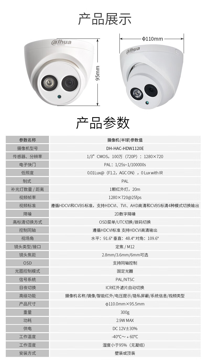 dahua大华模拟摄像头 同轴模拟半球摄像机 DH-HAC-HDW1120EQ