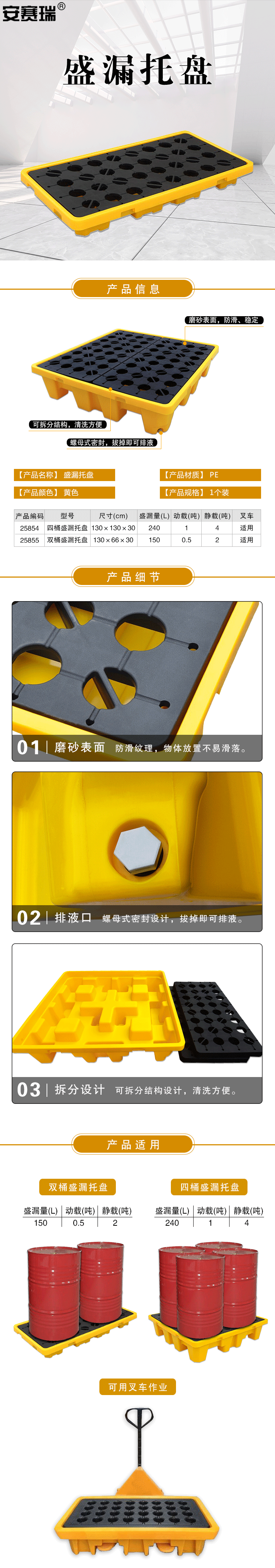 安赛瑞 四桶盛漏托盘 化学品油品泄漏预防托盘 聚乙烯防渗漏托盘容量240L 可叉车操作 130×130×30cm 25854
