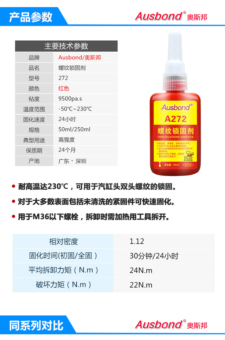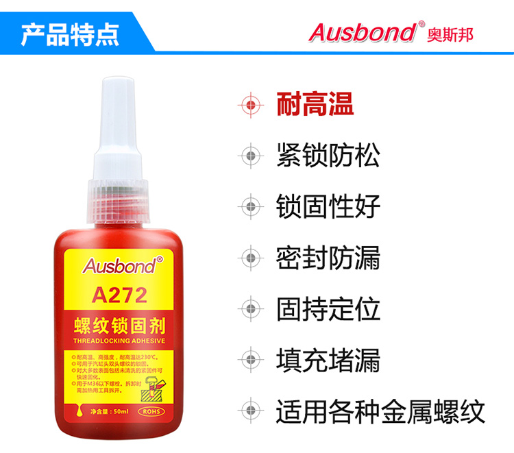 奥斯邦(Ausbond)272螺纹锁固剂厌氧胶螺丝紧固剂耐高温高强度货车气缸金属固定防松胶水密封胶红色50ml