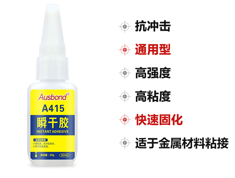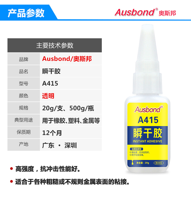 奥斯邦(Ausbond)415瞬干胶金属粘接快干胶粘铁铝合金塑料橡胶强力胶水多用途胶粘剂铸铁不锈钢门把手胶20g