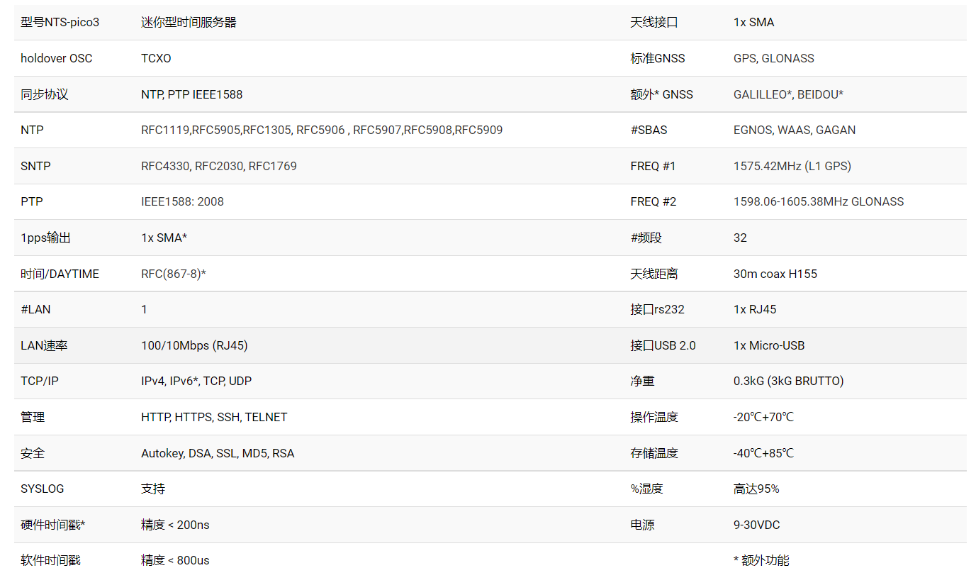 虹科NTS-pico3是下一代工业4.0,超小型时间服务器。它使用NTP和IEEE1588协议将时间直接传输到网络。它配备了一个支持IPv4/IPv6*的100/10 Mbps以太网端口。设备支持硬件PTP时间戳。设备还具有自然风冷。它是为自动驾驶汽车市场而设计的。它有非常快的时钟恢复功能,在GNSS没有准备好之前(冷/热启动问题)开始同步。这些设备还可以支持小型工业网络,并且可以全天候运行。特殊的机架“19面板可以支持多达6个NTS-pico3,共享一个GNSS天线和电源。该设备的电源范围为9-30VDC。配有GNSS天线和30米同轴电缆(SMA端)。船载天线内置GPS信号放大器(38dB增益)和TCXO保持振荡器,用于GNSS信号弱时的操作。