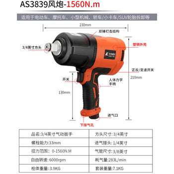 卡夫威尔 风炮 气动扳手 大扭力气动工具轮胎拆卸汽修机修 3/4"气动扳手1560N.m AS3839