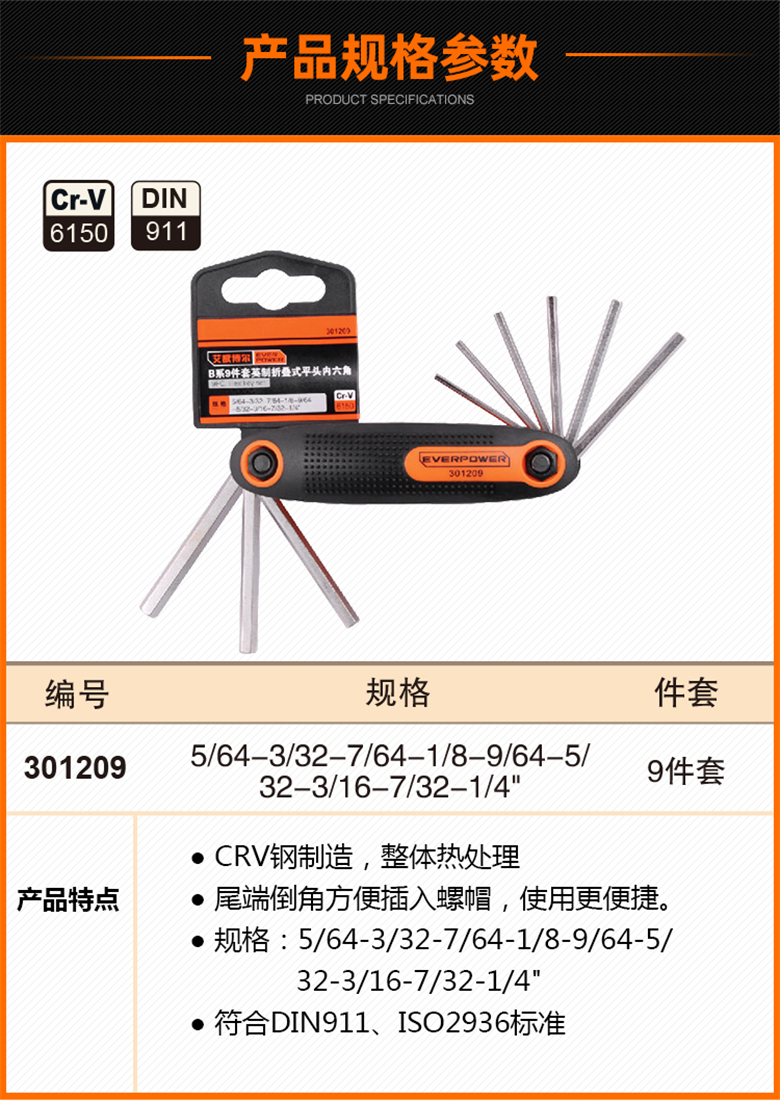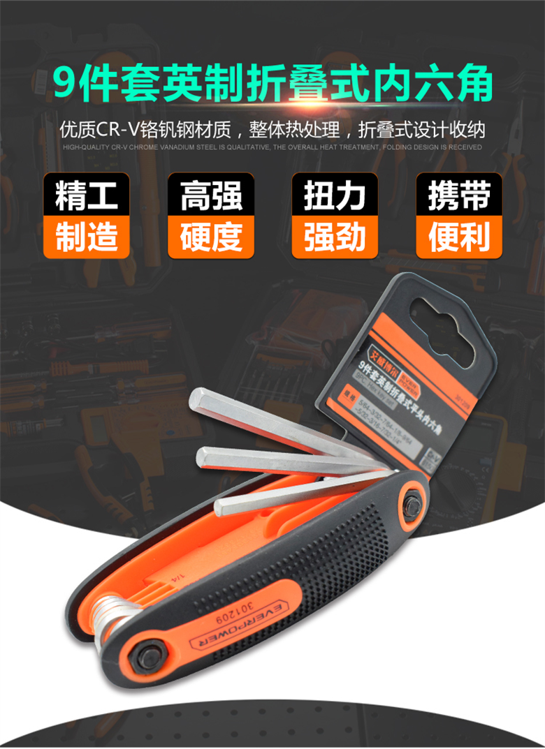 艾威博尔( EVER POWER) 301209 9件套英制折叠式内六角 【预计13天出货】