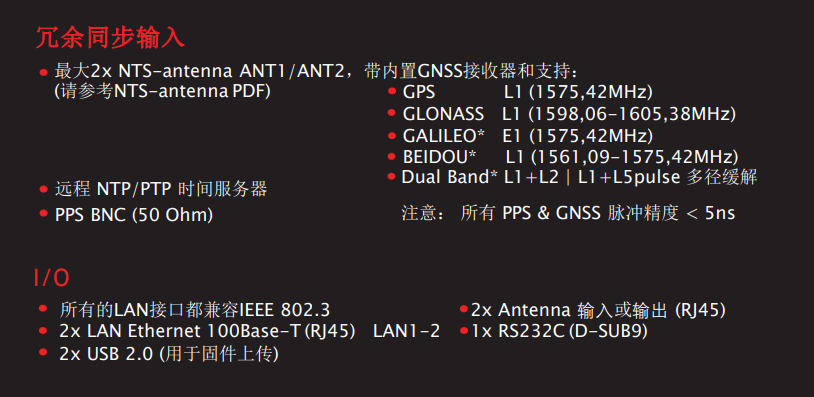 NTS-3000使用NTP PTPv2 IEEE1588协议直接将时间传递到LAN网络。 它配备了2个10 / 100Mbps以太网接口。 GNSS是标准的UTC参考时间。 服务器配备2个独立的GNSS输入(RJ45:ANT1和ANT2),因此它也可以支持卫星接收器。 可以将每个GNSS接收器配置为不同的卫星系统(GPS、GLONASS、GALILEO、BEIDOU)。 内置石英RTC时钟可确保在有限的短时间内丢失卫星信号的时间。 额外的OCXO *功能可提供强大的保持同步能力。