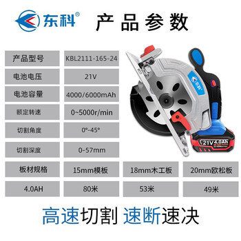 东科KBL2111-165-24 165锂电电圆锯6.5寸木工专用21V无刷手提电锯圆盘锯充电切割机(4.0三电两充基础)