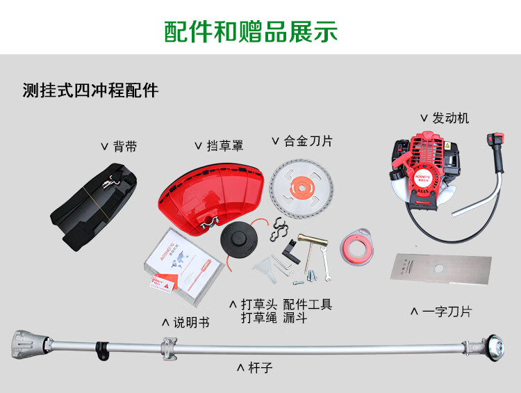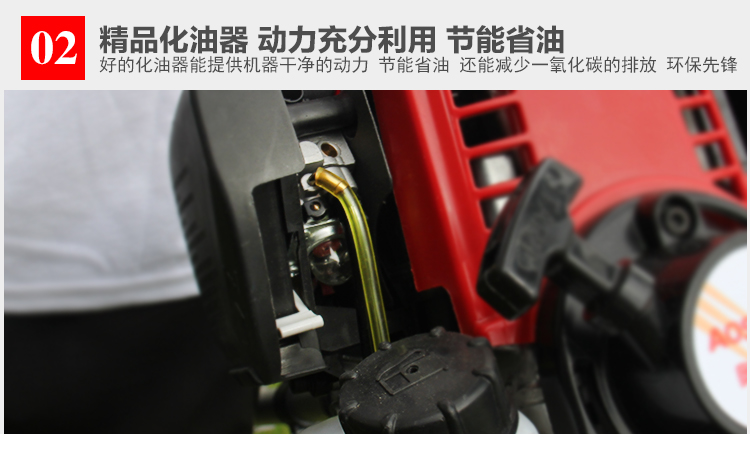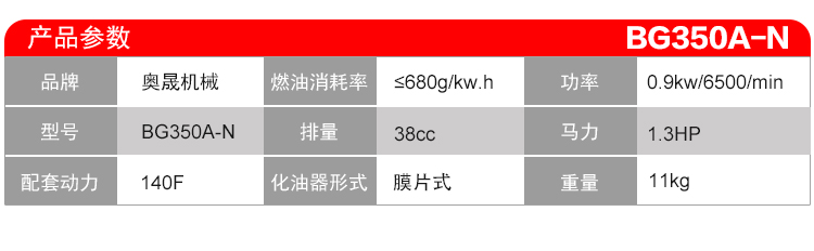 配套动力:140F 排量:38cc 功率:0.9kw/6500r/min 化油器形式:膜片式 燃油比:分离式 马力:1.3HP