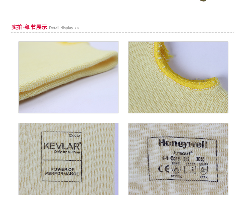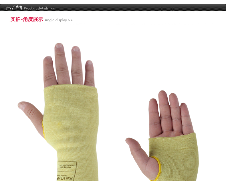 式样 针织 颜色 黄色 尺寸 均码 长度 45cm 衬里材料 KEVLAR® 符合标准 EN388 耐高温温度 100℃ 防割等级 3级 耐磨等级 1级 耐撕裂等级 2级 功能 防割