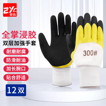 者也 12双 加厚浸胶防滑手套建筑工地防护手套 双层耐磨-加厚黄黑
