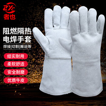 者也 加长牛皮电焊手套 牛皮革袖焊接手套 双层长款【灰色】1付