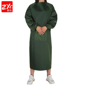 者也(ZYE)工厂屠宰水产劳保厨房食堂长款围裙围腰防水罩衣长袖防油防污工作服反穿衣带口袋罩衣 军绿色