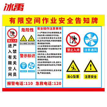 冰禹 BYlj-01 警告警示注意工作场所车间提示标志标识牌PVC 有限空间作业安全40*50cm