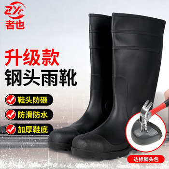 者也 防汛雨靴 长筒雨鞋 钢头防砸劳保胶鞋 工地安全防护雨靴 矿工靴防滑防水防油黑色 39码