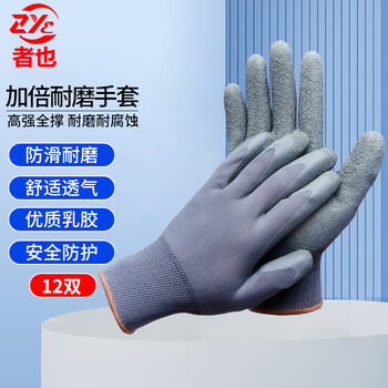 者也 12双浸胶发泡手套 挂胶皱纹防滑防油胶皮手套 皱纹掌灰色