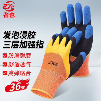者也 劳保手套 36双 加强发泡蓝黄橙 透气三层浸胶涂掌工作劳防