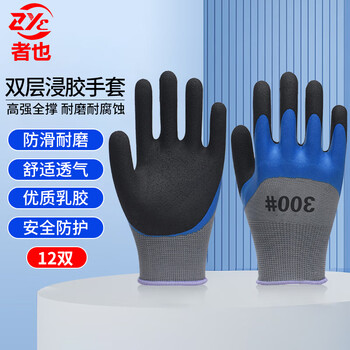 者也 12双劳保手套防滑乳胶防护手套浸胶手套 透气加强指宝石蓝黑