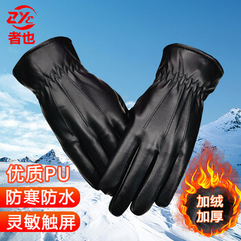 者也 男女秋冬季手套加绒加厚防寒保暖PU皮三道筋触屏手套 黑色